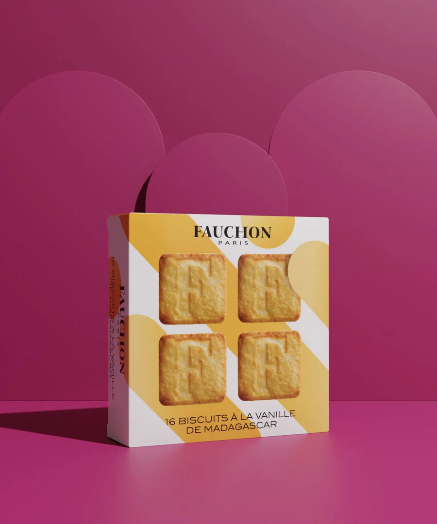 Les biscuits F de Fauchon à la vanille, dorés et sablés, sont nés en Bretagne, sous une pointe de sel de Guérande. Siglés F comme FAUCHON, ils se distinguent par leur croquant et leur parfum délicatement fruité et vanillé. Fabriqués en terre locale, avec des ingrédients de qualité, ces biscuits combinent des œufs frais de Lanouée, du beurre frais de baratte breton et de la vanille de Madagascar pour une combinaison douce et délicieuse.