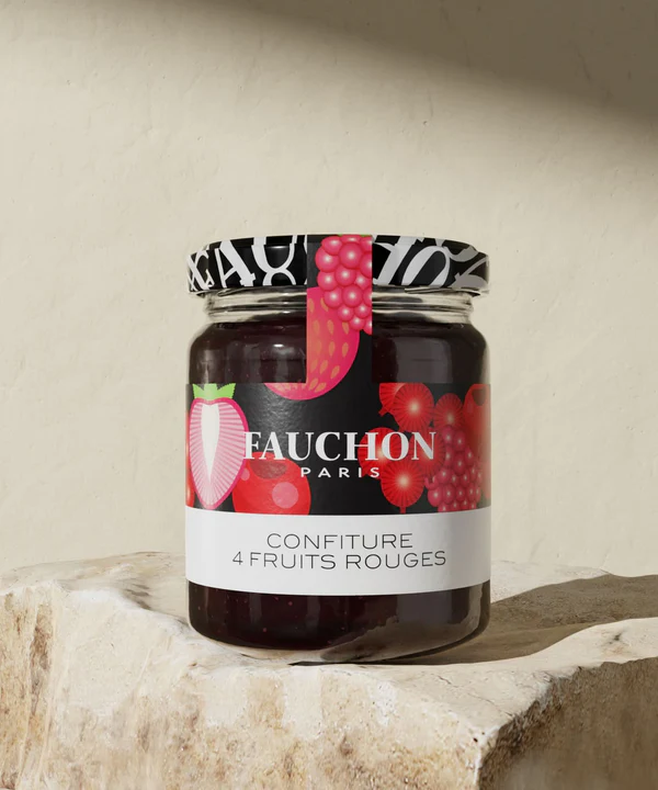 La confiture aux 4 fruits rouges Fauchon incarne l’équilibre parfait entre l’acidité de la groseille, la sucrosité de la fraise, l’acidulé de la framboise et la franchise de la griotte. Cette recette artisanale Fauchon est un concentré de fruits rouges, qui évoque tout le caractère chaleureux et frais de l’été. Pour préserver et intensifier les arômes et les parfums de ces fruits, Fauchon les sélectionne méticuleusement à leur juste maturité. Pour valoriser la qualité du produit, Fauchon perpétue la tradition à travers une cuisson des fruits lente et par petites quantités, au sucre de canne, dans des chaudrons de cuivre. Cette méthode ancestrale fait ressortir des saveurs caramélisées et miellées qui font la signature des confitures Fauchon.