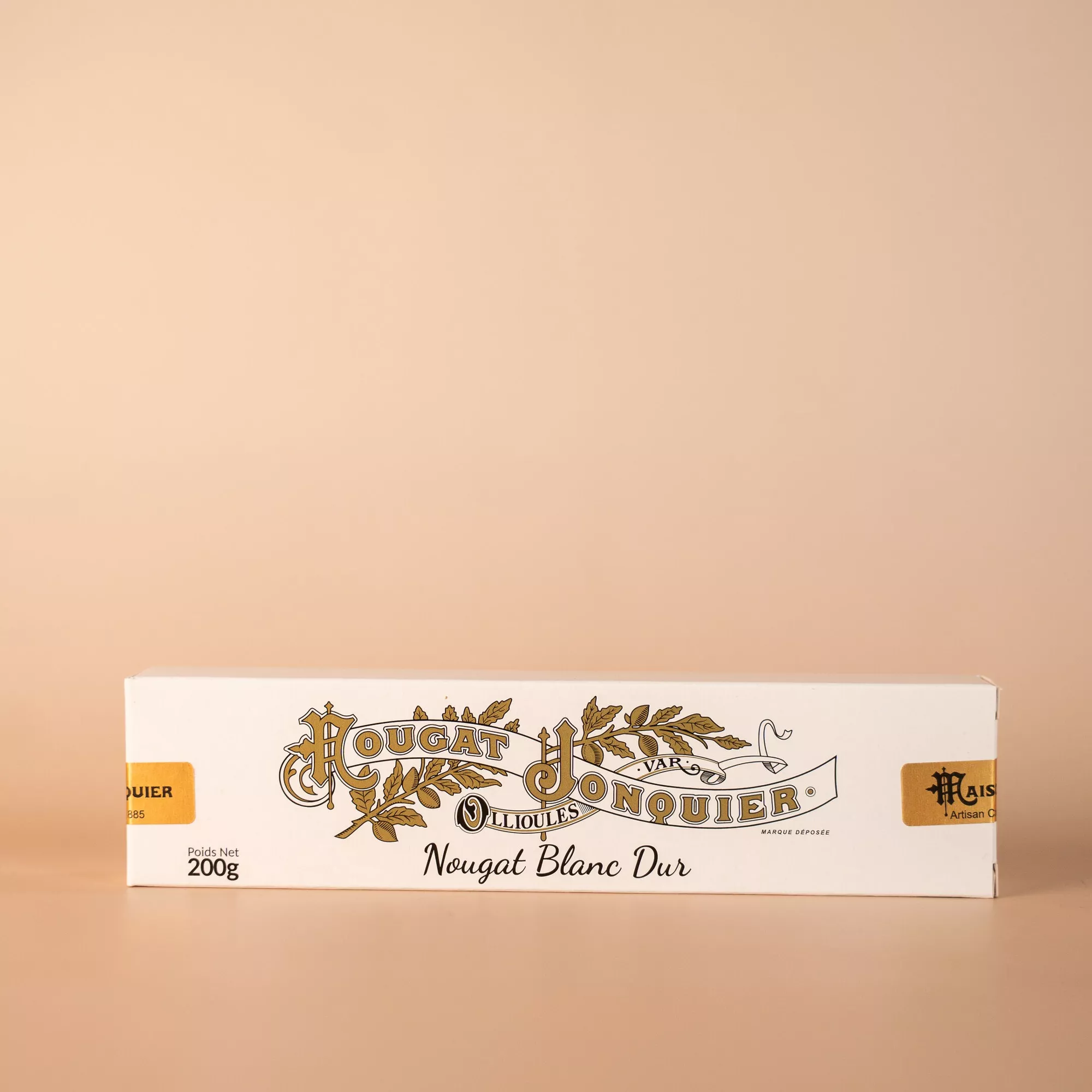 Fabriquée à Ollioules depuis 1885, cette barre de nougat blanc dur mêle 40 % d’amandes fondantes à des miels de lavande et d’oranger. Une confiserie délicate à savourer ou offrir.