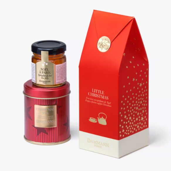 Glissés dans une pochette cadeau rouge vif constellée d’étoiles, une mini boîte de notre emblématique Christmas Tea aux délicieuses saveurs douces et fruitées et une spécialité de thé élaborée à partir du thé Noël à Paris aux saveurs gourmandes fruitées et finement épicées.