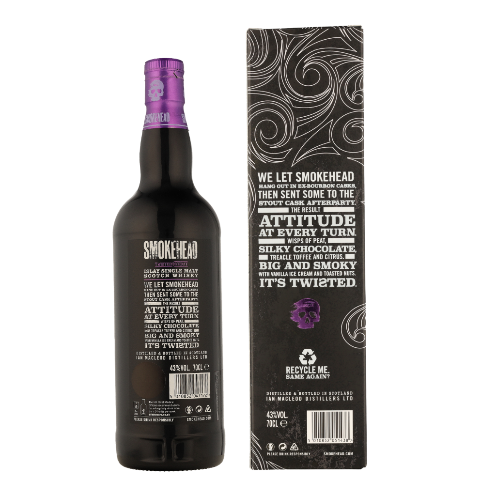 Smokehead Twisted Stout est fabriqué selon des méthodes traditionnelles dans des alambics pot still. L’utilisation d’orge maltée comme ingrédient principal assure les saveurs caractéristiques. Le whisky subit un vieillissement soigneux en fûts ayant contenu précédemment de la stout, ce qui contribue aux riches saveurs sombres. De plus, ce whisky n’est pas filtré à froid, ce qui apporte une profondeur supplémentaire au goût.